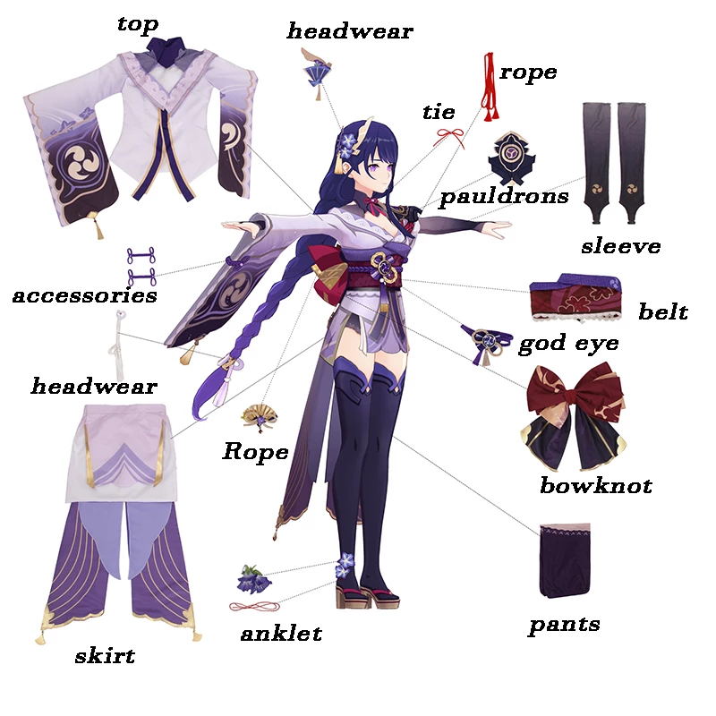 • Full Set: Top, Headwear, Rope+Accessories, Tie, Pauldrons, Sleeve, Belt, God Eye, Skirt, Anklet, Bowknot, Pants